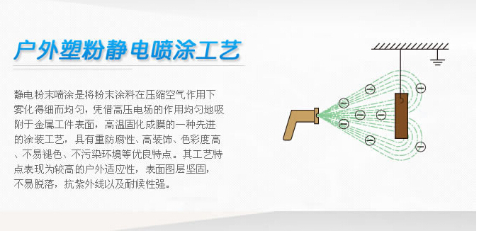 高溫靜電噴塑(奧爾特公共設(shè)施):用靜電粉末噴涂設(shè)備(靜電噴塑機(jī))把粉末涂料噴涂到工件的表面,在靜電作用下,粉末會均勻的吸附于工件表面,形成粉狀的涂層;粉狀涂層經(jīng)過高溫烘烤流平固化,變成效果各異(粉末涂料的不同種類效果)的最終涂層;噴涂效果在機(jī)械強(qiáng)度、附著力、耐腐蝕、耐老化等方面優(yōu)于噴漆工藝,成本也在同效果的噴漆之下。