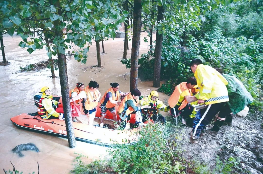 7月20日,受持續強降雨影響,河南省鄭州市單日降雨量突破歷史極值,單小時降雨量超過日歷史極值,嚴重威脅群眾生命財產安全。圖為當日,消防救援人員在該市唐莊鎮龍頭村轉移被困村民。